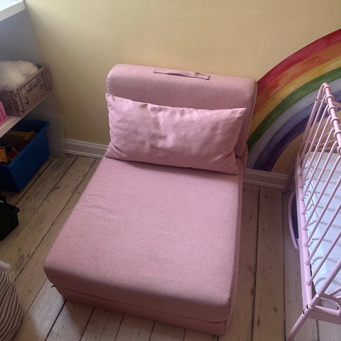 Sort kunstlæder. Kompakt stol der foldes ud til en sofa-lignende enkeltseng.