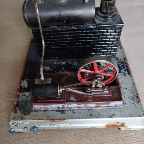 Hammer som bruges med drivrem til dampmaskine. Fremstillet af Langes Legetøj i 1940´erne. Langes Legetøj samarbejdede med Tekno og nøjagtig samme model findes som Tekno nr 704. Fungerer fint.