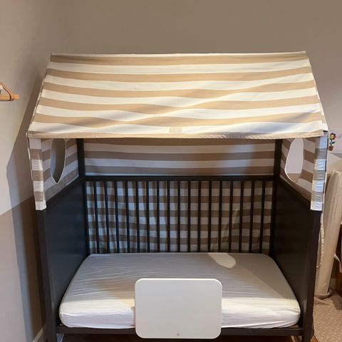 Lækker kvalitetsseng fra Stokke i farven Hazy Grey. Passer til børn 0-5 år. Til sengen medfølger en madras + to lagener og et lille tag i hvidt stof. Bunden kan hæves så den er i niveau med en voksenseng og den ene side kan tages af.
