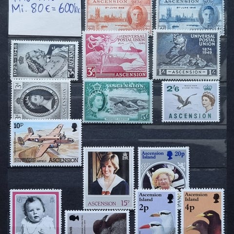 Engelsk koloni. Mellem år 1963 og 1976. I nydelig kvalitet. Michel 2019 katalog værdi 60 euro = 449 dkr. Inkl. 4 komplette sæt, samt 2 miniark. Alle er Dronning Elizabeth II mærker. Smukke motiver, fra et naturskønt område. En lille ø i Atlanterhavet, administreres sammen med Sct. Helena. Sendes gerne, uden planche, mod dækning af porto. Spar porto, se venligst mine andre frimærke- og postkort tilbud. Sælges meget billigt, UNDER 10 % af katalogværdi