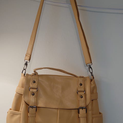 Vintage håndtaske med skulderrem. Meget i tvivl om den er i kunstlæder eller eller om toppen er ægte læder. Udvendige og indvendig lommer. Den har brugsspor så se diverse fotos. Længden ca 36 cm og højde ca 28.