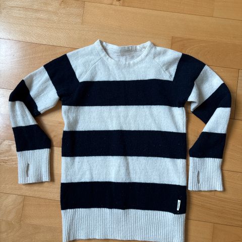 Det blødeste bløde 100% merinould! Den er brugt men i rigtig fin stand. Blå-grå farve med sorte blonder ved hals og ærmegab. 5-6 år, str. 116.
