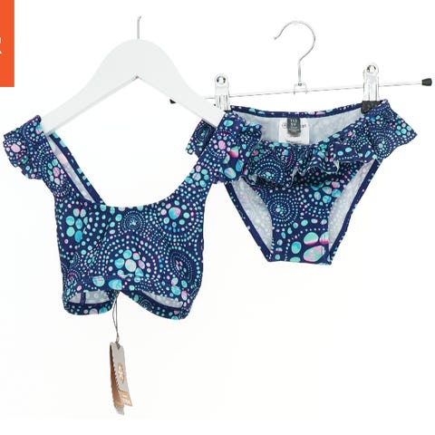 Rigtig sød bikini med flæser på både top og trusse. Mørkeblå med guldkanter og tryk af strandskaller. Str. 110-116.