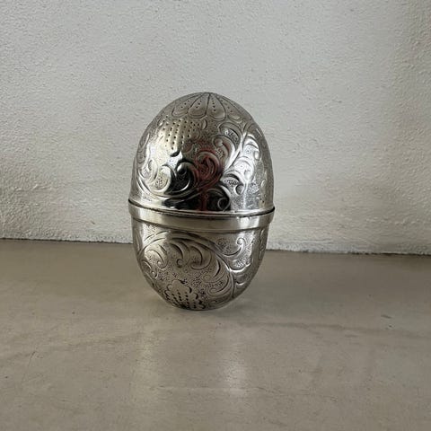 Æg, Æg, dekoration, fabrikeret af rød ler. H. 16 cm. Ø. 12,5 cm.