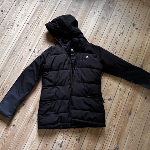Grå jakke med dobbeltradet knaplukning og en hvid, imiteret pelskrave. Jakken har lommer foran og skulderstropper. Indvendigt har jakken et mønstret for.