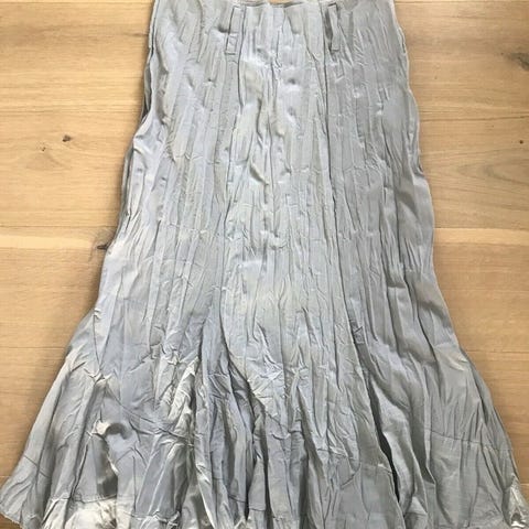 Næsten som ny, Unik og smuk nederdel. Lysegrå med hvide nålestriber. Ankellang. Crinkle effekt. Asymmetriske og rå syninger forneden. Virkelig flot!