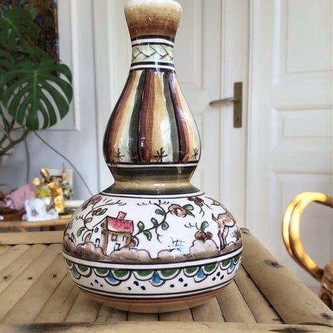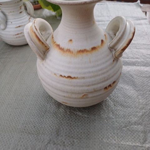 Super flot vase, ikke mindst pga. glasurens lyse/hvide grundfarve og det brune nærmest brændte mønster, som er spredt tilfældige steder på vasen.