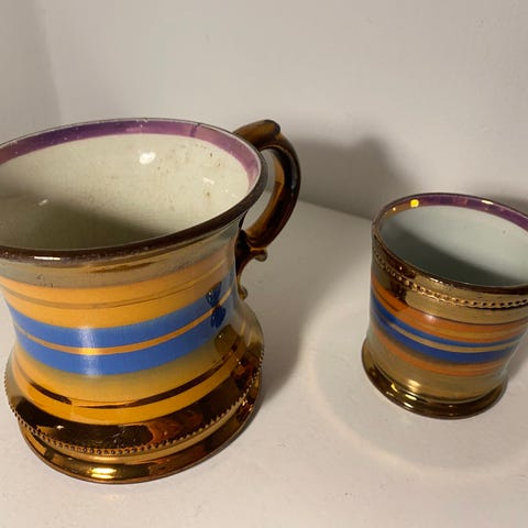 Lustre krus, Fajance, 125 år gl., Stort, antikt engelsk lustreemaljeret krus med blomsterbemaling. Kruset er ganske stort og er 9 cm højt. Diameter 9,5 cm plus hank. Det er håndmalet med blomster og bladværk på den gyldne lustrebund. Det er I perfekt stand uden skader. Står på Mols men kan gratis leveres I Aarhus og Ebeltoft eller sendes billigt på købers regning