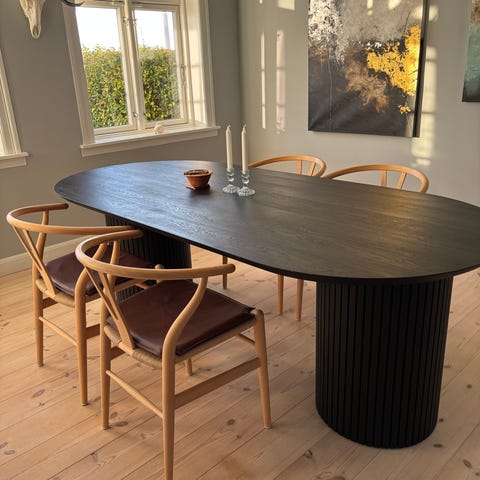 Håndlavet med store solide egetræs planker som tåler alt. Sprøjt lakeret rustfri stål ben i massiv. Et bord der kan alt og tåler alt