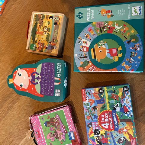 3 stk. små puslespil med dyremotiver i trææske, er som nyt