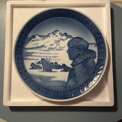 Fin mindeplatte for den dansk/grønlandske polarforsker Knud Rasmussen. Platteserie nr. 1. Platten er 19 cm i diameter.
