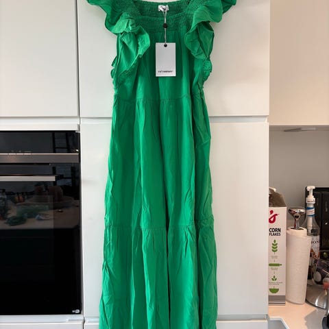 Gul Co’couture kjole med pink kirsebær og flæsekant for neden