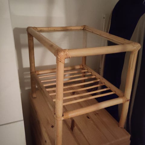 Pent hvitmalet bord i bambus med glassplate og hylle. Ingen risser elker sjader. 200kr