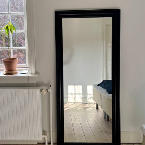 Stort spejl med træramme i kobber farve, kan males om. Mål kommer senere
