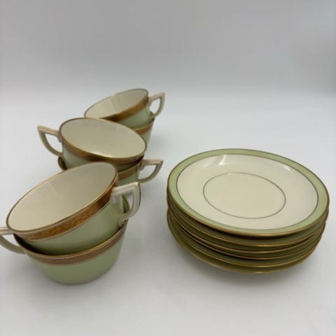 Royal Copenhagen Dagmar Tekop og Underkop No 9536. 22 cl. Pistaciegrøn og cremefarvet stel med guldkant designet af Thorkild Olsen i 1930erne