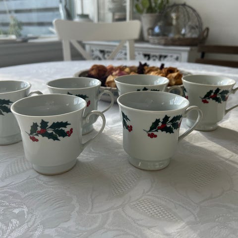 Ældre Samlinger Samlerobjekter Dele af Ældre Hvid Kaffestel julestel Jule Stel med Kristtjørn og Røde Bær