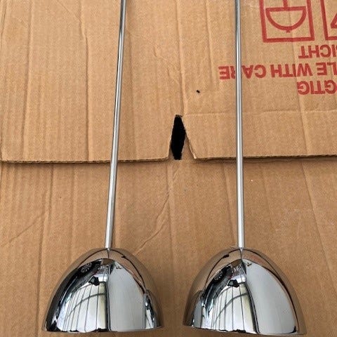 Købt samlet og ejet af mig siden 1998, og passer på mine ting… der kan være mikroskopisk patina på dem. Men en omgang polish kan sikkert få dem til at stå som nye!!! De er flotte i forvejen..
