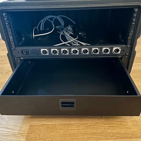 Rackskuffe 2U. Kan trækkes helt ud og fri af rack. Har været brugt til rackmonteret pedalboard og sælges, da jeg ikke længere har brug for den.