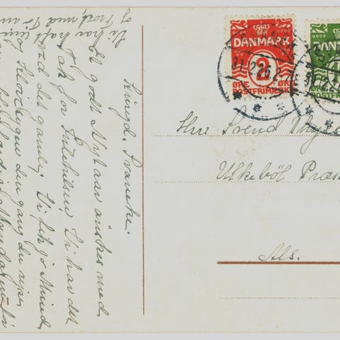 Nytårskort fra Skjoldager, dateret 30.12.1908, poststemplet samme dag i Grammby. Sendt til Resen pr. Skive i Danmark (det var udlandet den gang). Derfor frankeret med 10 Pf. rød.