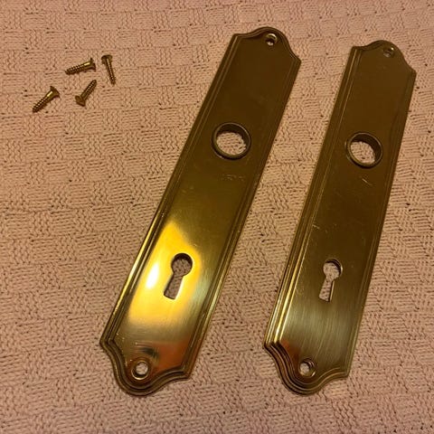 Nøgleskilte og rosetterne er rense for gammel maling og malet sort. Ikke monteret efter de er blevet malet, da det er overskud.
