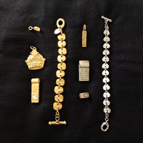 Dyrberg/Kern smykkesæt bestående af flere dele i sølvbelagt og forgyldt metal. Sættet omfatter blandt andet armbånd og vedhæng i både sølv- og guldfarvet finish. Smykkerne har forskellige former og detaljer, herunder runde og aflange led samt enkelte sten- og logo-detaljer. Velegnet til kombination på tværs af de forskellige dele for et ensartet udtryk i sølv- og guldfarver.