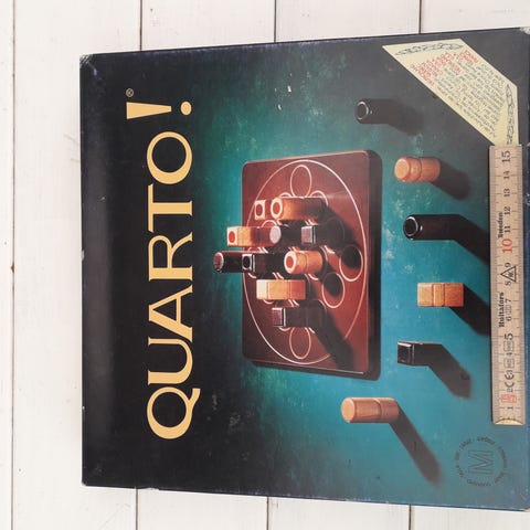 spilleplade med 4x4 felter og 16 brikker med forskellige former og markeringer. et spil tager 5 minutter, revanchen ca. 2 timer. Jeg sender med DAO på din regning men ikke med fiks og færdig.
