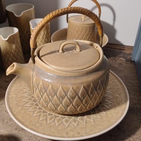 3 kaffekopper, 4 underkopper, 4 kagetallerkener og en sukkerskål