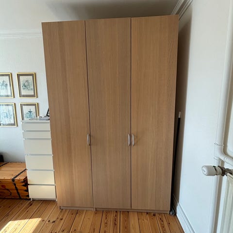 Fin garderobeskab har ingen fejl eller mangler og står flot, der er kun nogle brugsmærker på to af hylderne (som man evt. kan tilkøbe i jysk eller ikea hvis man ønsker helt nye hylder )