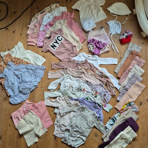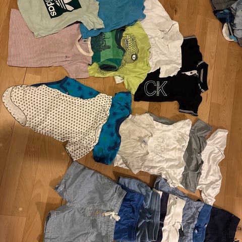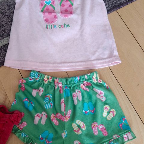 Sommertøjpakke str. 110 med 14 dele. I pakken er der 4 x sæt (hvid flamingo sæt brugt mest), 3 x 3/4 bukser (røde ubrugte, OBS jeg husker dem som værende lange 3/4 bukser) og 3 x shorts hvoraf to er brugt få gange (enhjørninge shorts brugt). Shorts kan ikke reguleres i livet. Blå, pink og orange farver er ikke så kraftige som billederne viser. Samlet pris.