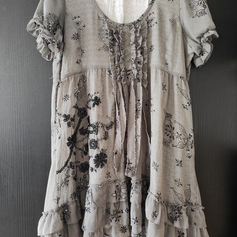 Flot lang kjole fra cream str 34. Bindebånd I taljen og lidt puffede ærmer. Lækker blød kvalitet.