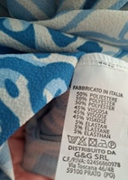 Farverne er hvid og lyseblå samt mørkere blå bort på nederste kant samt ærmekanter