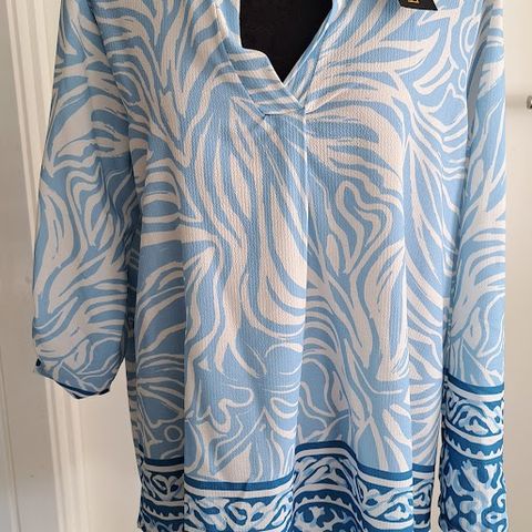 Tunikaen har v-udskæring - ærmer der kan knappes op til 3/4, den er længere foran end bagpå.