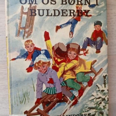 Mere om os børn i Bulderby. Bog, vi har haft længe. Måske er det en udfaset biblioteksbog. Jeg kan ikke huske det. Alle sider er der, og bogen er, som billederne viser