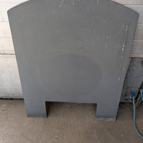 Vores gode gamle Vermont brændeovn er afgået ved døden, og vores 1/4 cirkel formede pejseplade i stål fra hjørnet (hvor brændeovnen stod) er blevet overflødig.