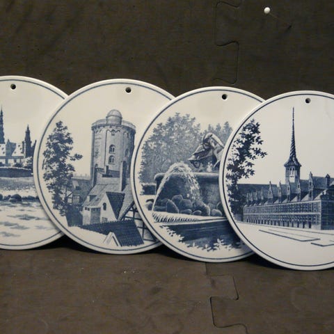 Flotte dækkebrikker med motiv fra Kong Frederik 6 s dessertstel. Slottene Fredensborg, Rosenborg, Kronborg, Frederiksborg. 4 stk I flot stand. Æske med lidt ridser. Kr 175.