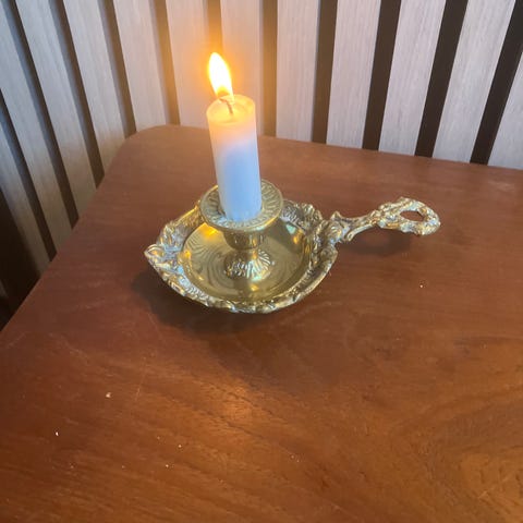 Smuk antik messing kammerstage på rektangulært fad og med fingerhåndtag. Fra 1800 tallet.