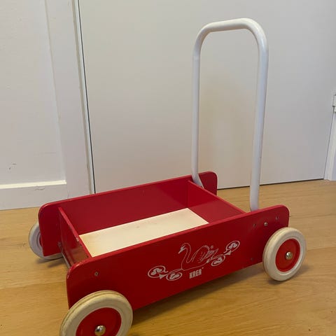 BR gåvogn i træ med klodser, med en lille skræmme på siden (se billedet)