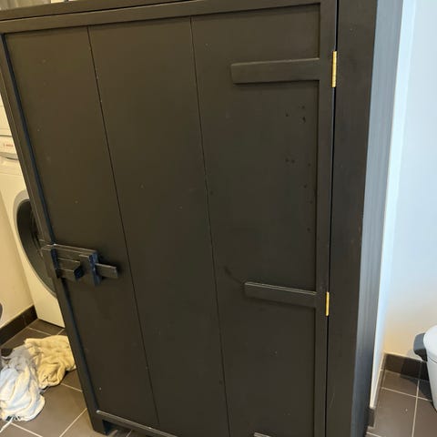 Super fedt snedkerfremstillet skab med skydelåger. Er udført i sort mfg med egefiner og med sort designboard låger. Unikt møbel, som er blevet specialfremstillet til os.