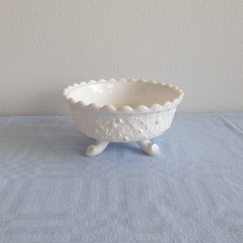 ovnfast skål af hvid opalglas fra Fire King.