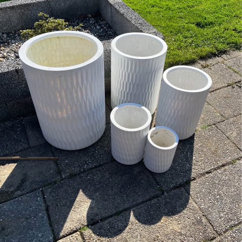 Potter/krukker, Smukke krukker - ikke frostsikre. Perfekte til ex. Havestuen. Obs på brugsspor på det ferskenfarvede bånd- dette kan males op igen.