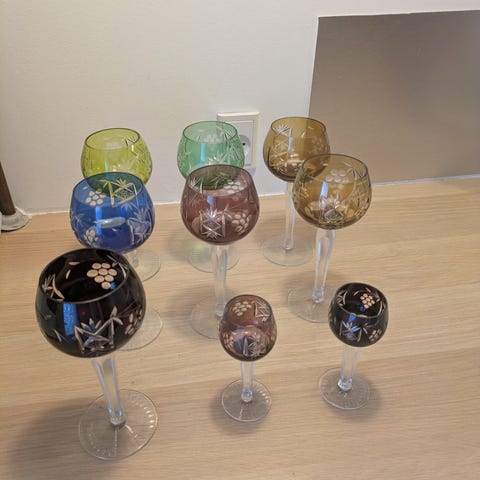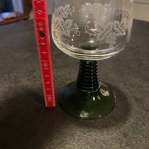 Otte rømerglas af grønt glas, hul fod, stilk med påsatte blomster. H 18,5 cm. - slutningen af 1800-tallet. 1 glas med minimalt afslag på fod. 90 kr. pr. stk. eller 500 kr. samlet