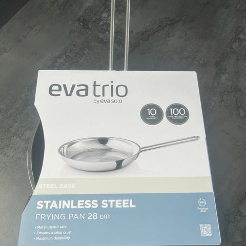 NY stor stegepande fra eva trio by eva solo sælges. 28cm, egnet til induktion, kan klare både en tur i ovnen og i opvaskemaskinen. Honeycomb base, dvs. stegepanden har 'vaflet' bund med et unikt mønster, der er med til at forhindre maden i at brænde sig fast. Den vaflede bundflade holder fedtstoffet fordelt under maden og danner en naturlig slippeevne.