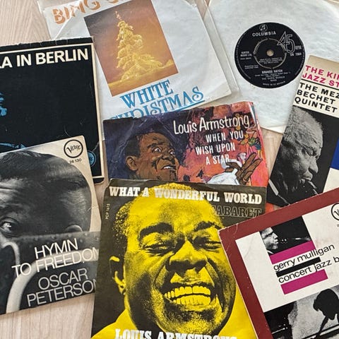 Ella, Louis, Gerry og Oscar og andre - alle gode gamle jazz-navne. Her er 8 single-plader. Sælges samlet for 70 kr.
