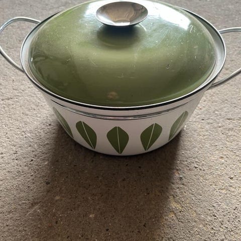 Emaljeret Støbejernsgryde med holder af bambus-omviklet metal og tektræsben.