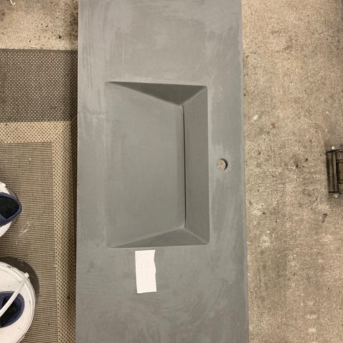 Beton bordplade med vask 124x55x3 cm. Har aldrig være monteret. Pris 300kr. Giv et bud