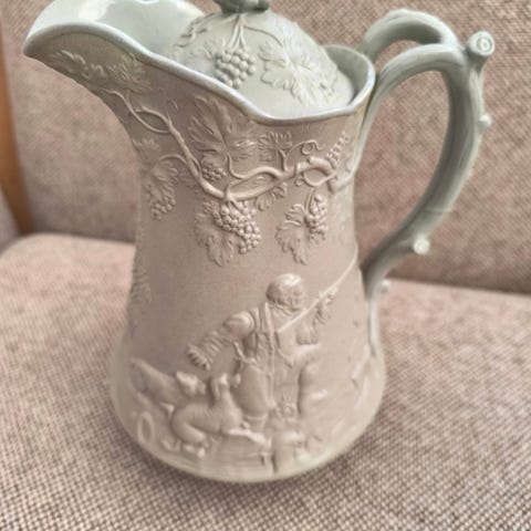 Et sæt med to lustre kander. Fra England, 19. århundrede. Med blåt bånd. Sælges samlet.