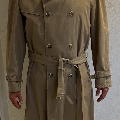 DAKS Signature uldforet cottoncoat. Vurderer den til str XXL. Der står str 32 i den og det er italiensk størrelse. Den måler 72 cm fra ærmegab til ærmegab og ca 130 i længden. Virkelig lukses med uldfor og læderspænder.