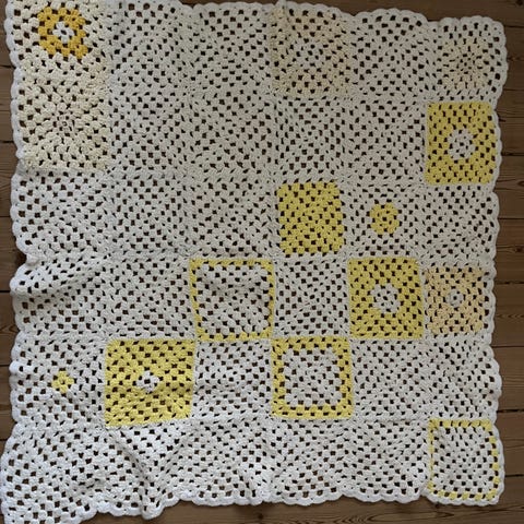 Flot hvidt hæklet tæppe. Enkelte ujævnheder (se billeder ). 150 x 175 cm.