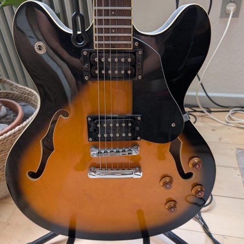 Super velholdt Ricwood 335 . Med flightcase. Den har ikke spillet meget da jeg har fået gigt i mine fingre. Den flotte mørkegrønne farve er dyb og lækker ny pris 549€