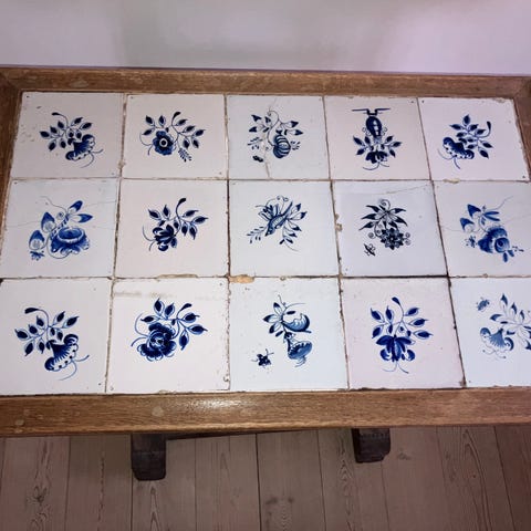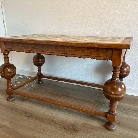 Smukt lille kakkelbord- sidebord - bord med skuffe. Malet grå med guld. Højde 68 cm bredde 81 dybde 54,5 pris er fast